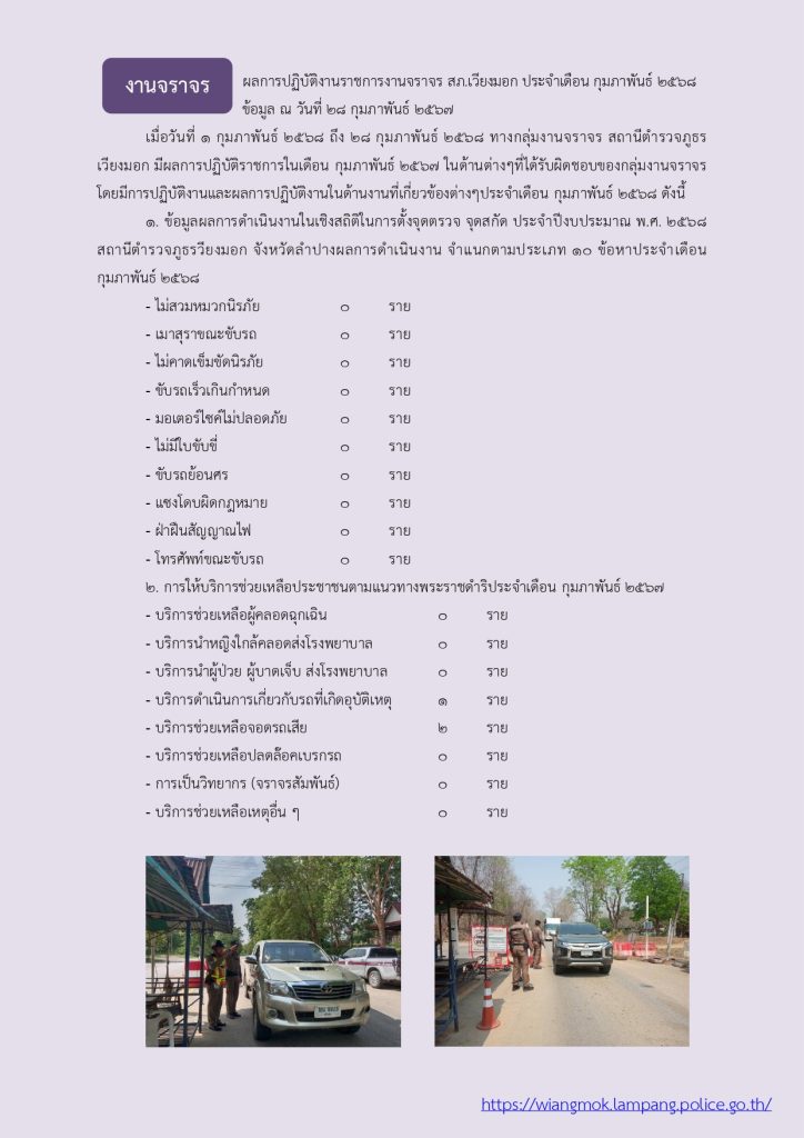 ผลการปฏิบัติ งานจราจร ประจำเดือน กุมภาพันธ์ 2568 28 กุมภาพันธ์ 2568 โดย veangmok / งานจราจร Facebook iconFacebookTwitter iconTwitterLINE iconLine