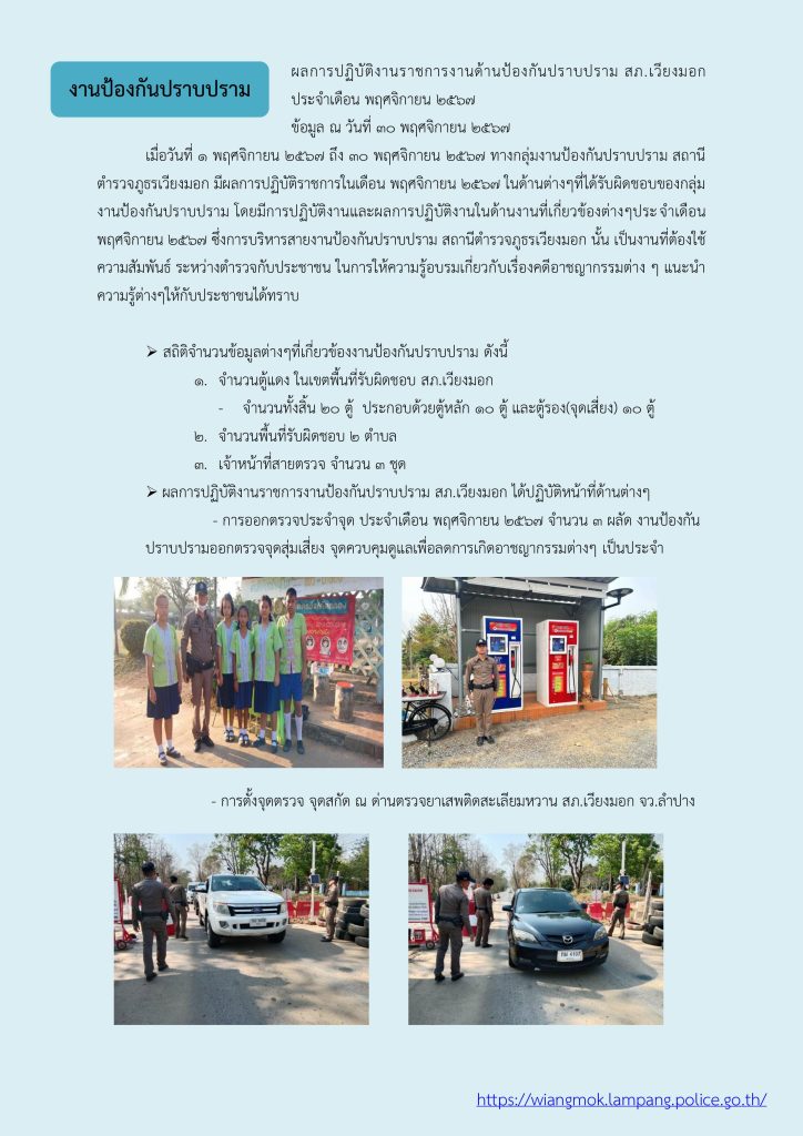 ผลการปฏิบัติ งานป้องกันปราบปราม ประจำเดือน พฤศจิกายน 2567 30 พฤศจิกายน 2567 โดย veangmok / งานป้องกันปราบปราม Facebook iconFacebookTwitter iconTwitterLINE iconLine