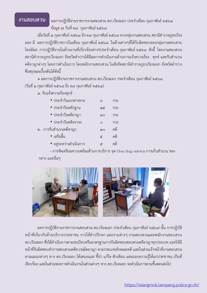 ผลการปฏิบัติ งานสอบสวน ประจำเดือน กุมภาพันธ์ 2568 28 กุมภาพันธ์ 2568 โดย veangmok / งานสอบสวน Facebook iconFacebookTwitter iconTwitterLINE iconLine