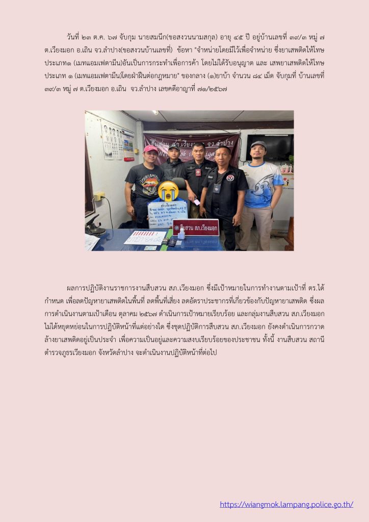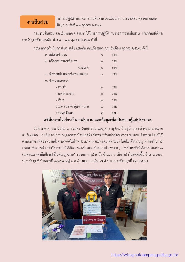 ผลการปฏิบัติ งานสืบสวน ประจำเดือน ตุลาคม 2567 31 ตุลาคม 2567 โดย veangmok / งานสืบสวน Facebook iconFacebookTwitter iconTwitterLINE iconLine