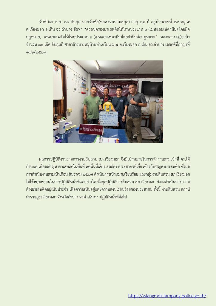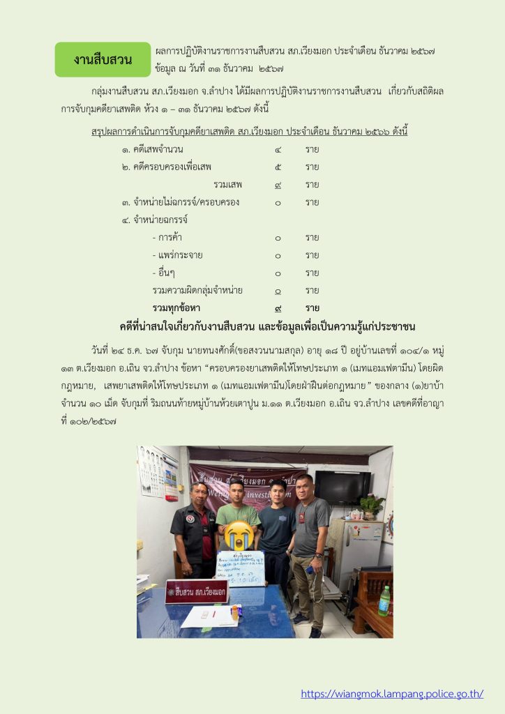 ผลการปฏิบัติ งานสืบสวน ประจำเดือน ธันวาคม 2567 31 ธันวาคม 2567 โดย veangmok / งานสืบสวน Facebook iconFacebookTwitter iconTwitterLINE iconLine
