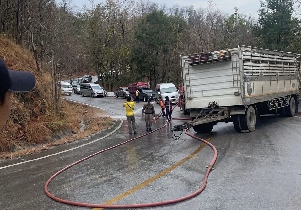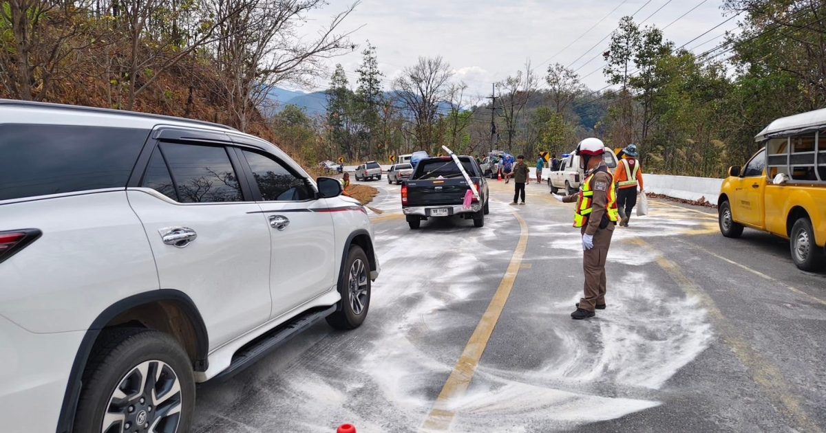 วันที่ 24 ก.พ. 2568 เวลาประมาณ 10.30 น ศูนย์วิทยุ สภ.เวียงมอกได้รับแจ้งว่าเกิดอุบัติเหตุที่ถนนเถิน-ทุ่งเสลี่ยมถนนหมายเลข 106 ทางขึ้นเขาผีปันน้ำ หมู่ที่ 3 ต.แม่มอก อ.เถินฯ พ.ต.อ.เอนก อุตะมะ ผกก(สอบสวน) กลุ่มงานสอบสวน ภ.จว.ลำปาง รรท.ผกก.สภ.เวียงมอก,พ.ต.ท.สมบัติ พุ่มเพชรษา พงส.เวรพร้อมด้วยเจ้าหน้าที่ตำรวจสภ.เวียงมอก กู้ภัยหนองหอย,ปภ.แม่มอก,หมวดการทางเถิน ได้ร่วมกันทำความสะอาดถนนและโรยสารเคมีบนถนนเนื่องจากมีคราบน้ำมันจากรถยนต์ที่เกิดอุบัติเหตุไหลมายังผิวถนนซึ่งจะทำให้รถที่สัญจรไปมาเกิดอุบัติเหตุซ้ำซ้อนได้ พ.ต.อ.เอนก อุตะมะ ได้ลงมาสั่งการและควบคุมการปฏิบัติด้วยตนเองจนทำให้สามารถเคลียเส้นทางให้ผู้ใช้รถใช้ถนนสามารถใช้เส้นทางทั้งสองเลนได้ตามปกติ สำหรับสาเหตุการเกิดอุบัติในครั้งนี้คาดว่าเกิดจากผู้ขับขี่ ขับขี่ด้วยความประมาทและทัศนวิสัยไม่ดีมีฝนตกทำให้ถนนลื่นถนนเป็นทางโค้งซึ่งจุดนี้เมื่อเกิดฝนตกทำให้เกิดอุบัติเหตุอยู่บ่อยครั้ง สภ.เวียงมอกได้แจ้งเตือนให้ผู้ใช้รถใช้ถนนได้รับทราบแล้วและได้ติดธงแดงเพื่อเป็นการแจ้งเตือนให้ผู้ใช้รถใช้ถนนได้ใช้ความระมัดระวังก่อนถึงจุดนี้เมื่อเทศกาลปีใหม่ 2568 ที่ผ่านมา สภ.เวียงมอกห่วงใยผู้ใช้รถใช้ถนนทุกๆท่านโปรดใช้ความระมัดระวังเป็นพิเศษเมื่อขับรถมายังจุดนี้โดยเฉพาะเมื่อเกิดฝนตก ขอให้ผู้ใช้รถใช้ถนนเดินทางถึงที่หมายด้วยความสวัสดิภาพ ด้วยความปราถนาดีจาก สภ.เวียงมอก จ.ลำปาง